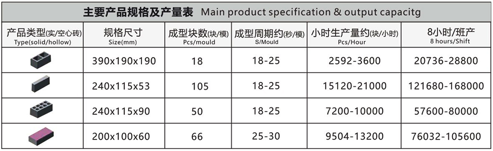 用途:生產各種外墻砌塊、內墻砌塊、花墻砌塊、樓板塊、護堤塊、連鎖塊、路緣石等砌塊。增加面料裝置可生產彩色路面磚。